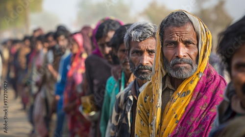 © Sasint, Fototapeta premium A long line of people waiting at a food distribution center, their faces weary and anxious, illustrating the desperation caused by food scarcity