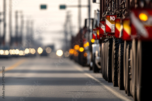 © eaglesky, Fototapeta premium A long line of trucks are on the road with a sign that says no. Concept of congestion and frustration as the trucks are stuck in traffic