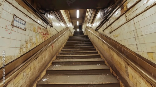Obraz premium A long, narrow, and empty staircase in a subway station