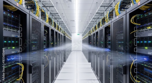 © soem, Fototapeta premium A long, narrow hallway with rows of server racks in a data center.
