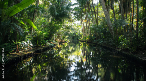 © ImageKing, Obraz premium A long, narrow pond sits in the heart of a thick, untouched jungle.