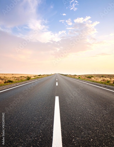 © stylub, Fototapeta premium A long open road stretching into the distance under a beautiful sky at sunset.