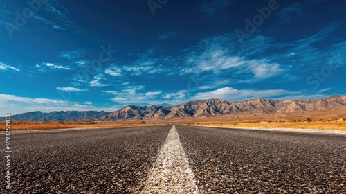 Fototapeta premium A long, paved road stretches into the distance, beneath a vibrant blue sky, dotted with fluffy white clouds. Mountains are visible in the background
