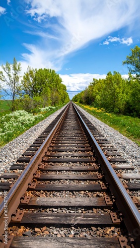 © Saro, Fototapeta premium A long railway track stretches to the horizon, flanked by lush greenery under a vibrant blue sky