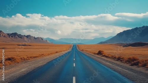 © Rasim, Fototapeta premium A long road extends into the distance, framed by a dramatic blue sky, creating a captivating scene of a long road that invites exploration and adventure along its path.