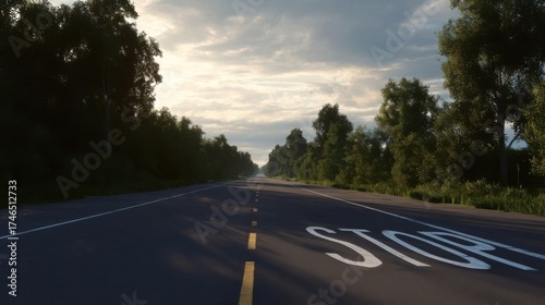 © hai, Fototapeta premium A long road stretches into the distance surrounded by trees with a STOP marking visible on the pavement.