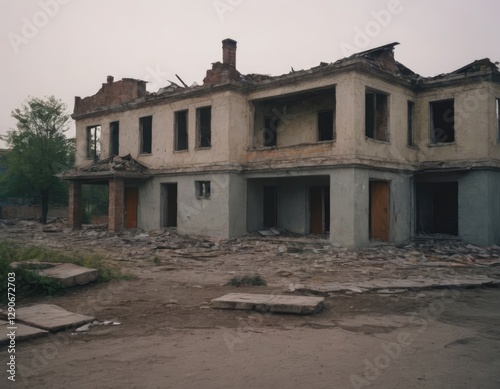Naklejka premium A long row of abandoned, dilapidated buildings featuring a yellow door