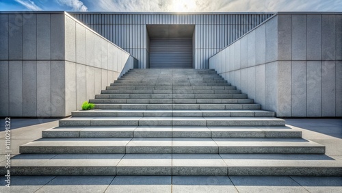 © Collection, Fototapeta premium A long staircase leading towards a doorway with a modern gray facade in the background