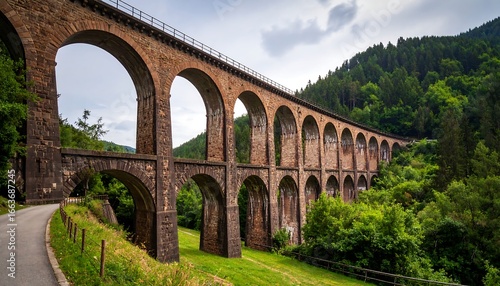 Obraz premium A long stone arch bridge spans a valley, surrounded by lush green forest,...