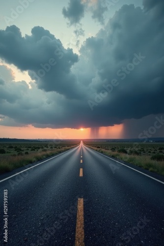 Naklejka premium A Long, Straight Asphalt Road Leads to a Sunset Underneath a Dramatic, Dark Cloud Formation