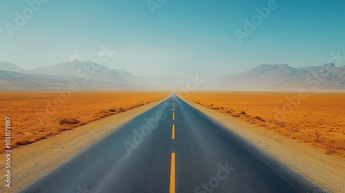 © Purnomo adi, Naklejka premium A long, straight asphalt road stretches into the distance, disappearing into the horizon. The road is lined by dry, golden desert grass and mountains in the background.