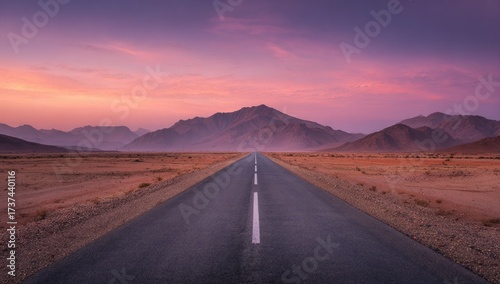 © Soto, Fototapeta premium A long, straight asphalt road vanishes into a hazy desert landscape at sunset, silhouetted against a vibrant purplish-pink sky and distant mountains
