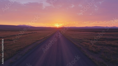 Fototapeta premium A long, straight gravel road stretches into the distance, leading towards a vibrant sunset. The sky is filled with shades of pink, orange, and purple, creating a dramatic and beautiful horizon.