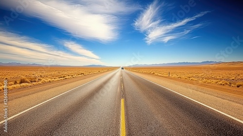 Fototapeta premium A long, straight highway stretching across a desert landscape, with vast open...