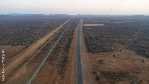 Naklejka premium A long straight road cutting through a dry, rural landscape from above