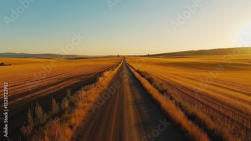 © embun, Naklejka premium A long straight road going through a golden wheat field
