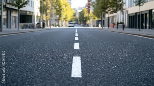 © Galib, Fototapeta premium A long, straight road in a residential neighborhood with fallen leaves on the sides.
