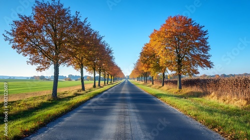 © Genta, Obraz premium A long, straight road lined with trees in vibrant autumn foliage.