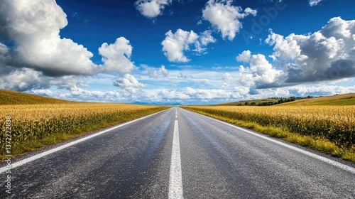 Naklejka premium A long straight road stretching into the horizon with endless cornfields on both sides.