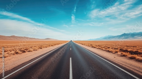 © วรรณภา มะโนศรี, Fototapeta premium A long stretch of an empty highway, cutting through the desert landscape with a single car in the distance, symbolizing freedom and the adventure of a solo road trip.