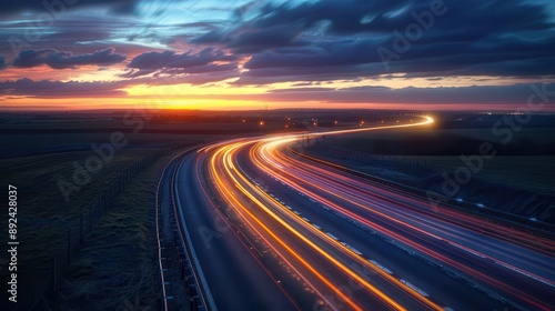 Naklejka premium A long stretch of highway at dusk with streaks of light from passing cars. Wall art, leaflet, and poster design, website, and media decor. Commercial use, 300 dpi.