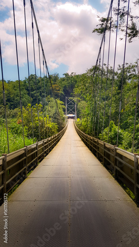 © Ridwan, Obraz premium A long suspension bridge stretches into lush green forest under a partly cloudy sky, creating a scenic and peaceful pathway through nature.