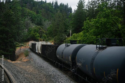 Naklejka premium A long train with a mixed manifest of boxcars and tankcars, showing freight of goods such as fossil fuels and phosphate. The train is in a forest, alluding to the vast distances of American transport.