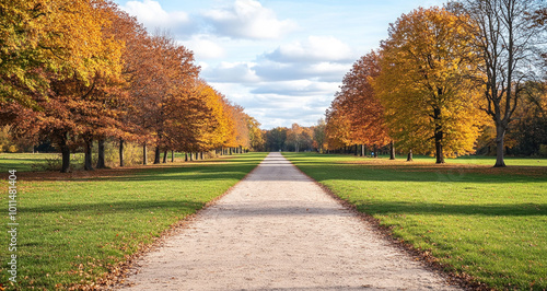 © thiquynh, Fototapeta premium A long, tree-lined path in the fall, covered with larch trees, with yellow leaves and green grass on both sides.