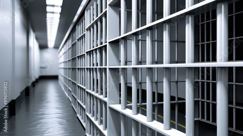Fototapeta premium A long, white corridor in a prison with barred cell doors and a yellow line...
