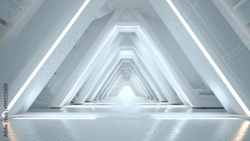 © Anastasiia, Obraz premium A long white futuristic hallway with repeating triangular arches and glowing edge lighting. Concept Futuristic white hallway, Repeating triangular arches, Glowing edge lighting, Symmetry and depth
