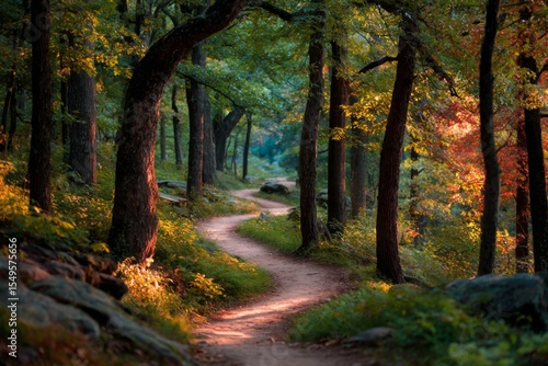 Obraz premium A long winding forest path flanked by color-shifting trees, symbolizing...