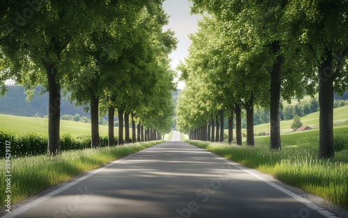 Fototapeta premium A long, winding road through a lush green forest.