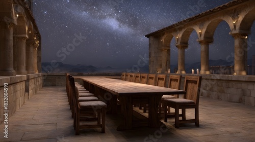 © Thares2020, Obraz premium A long wooden banquet table with chairs is set on an ancient stone terrace under a vibrant starry night sky