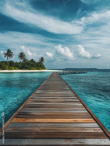 Fototapeta premium A long wooden pier leading into the ocean against a backdrop of palm trees...