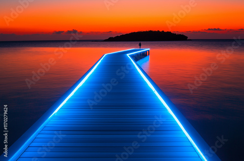 © 44designstore, Fototapeta premium A long wooden pier lit up with LED lights leads into the ocean at sunset, with an island in view and calm waters