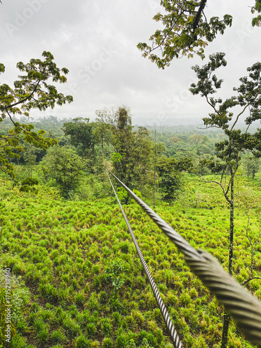 Fototapeta premium A long zipline cable stretches into the distance over a lush green valley in Costa Rica.