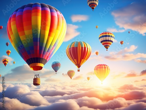 © Khaligo, Naklejka premium A lot of colorful hot air balloons in the sky, aerial view, transportation concept