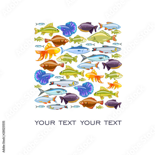 © suhotcheva, Naklejka premium A lot of fish. Set: chub, ruff, gold, flounder, crucian carp, rudd, tuna, carp, piranha, cockerels. Square