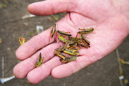Fototapeta premium A lot of locusts on a man's palm. Locust invasion
