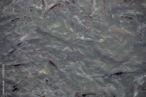 Obraz premium a lot of Pangasius fish at riverfront of temple in Thailand