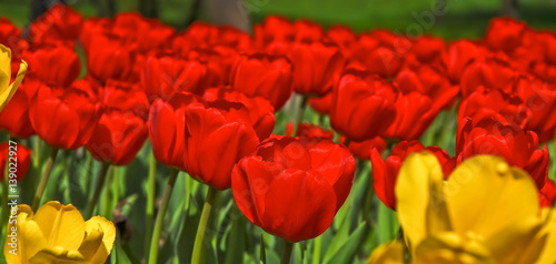 Fototapeta premium A lot of red and a few yellow tulips. Background