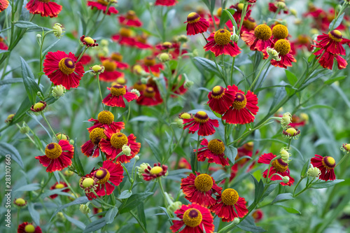 © Olesya, Obraz premium A lot of red flowers on a green background close-up.