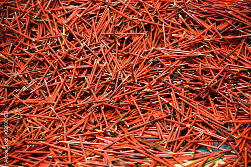 © krutenyuk, Fototapeta premium A lot of red pencils chaotic arranged