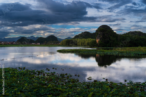 © Jiang Yao, Fototapeta premium A lotus pond at sunset