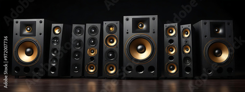 © Prateek, Obraz premium A loudspeakers set for music and sound surround home theatre system placed in dark background with modern style light or glowing with copy space, sound system banner design