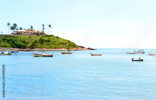 Naklejka premium A lovely bay with some little boats and a sand beach in Meaìpe a small fishing village near Guarapari in the Espirito Santo state in Brazil