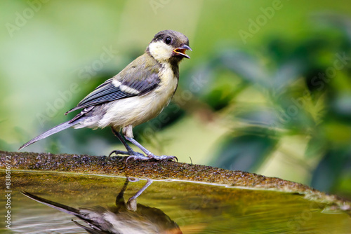 Obraz premium 泉で水浴びする可愛いシジュウカラ(シジュウカラ科)の幼鳥。日本国神奈川県秦野市、弘法山公園、権現山バードサンクチュアリにて。 2022年7月撮影。...