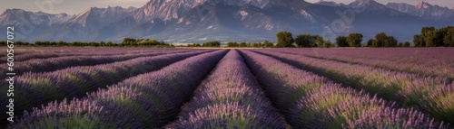 Obraz premium A lovely lavender fields with mountains in the backg. Horizontal banner. AI...