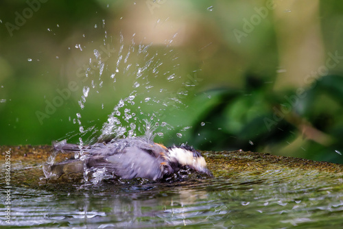 © d3_plus, Fototapeta premium 泉で水浴びをする可愛いヤマガラ(シジュウカラ科)。日本国神奈川県秦野市、弘法山公園、権現山バードサンクチュアリにて。 2022年7月撮影。A lovely Varied Tit (Sittiparus varius) bathing in a spring.