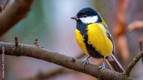 © VolumeThings, Fototapeta premium A lovely yellow breasted bird perches on a tree branch